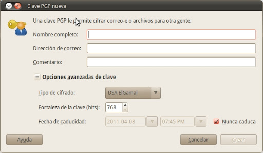 El sistema nos pedirá a continuación que introduzcamos nuestro nombre, dirección de correo electrónico y un comentario. Éste último es opcional, mientras que los dos primeros son obligatorios. La dirección de correo electrónico que se escoja debería ser una válida, ya que ésta será usada para firmar el identificador de usuario. Si esta dirección se modifica en algún modo, la firma no corresponderá. Las claves serán generadas en base a estos datos.